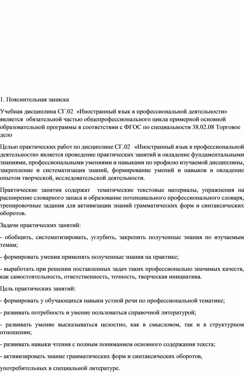Учебная дисциплина СГ.02 «Иностранный язык в профессиональной деятельности» является обязательной частью общепрофессионального цикла примерной основной образовательной программы в соответствии с ФГОС по специальности 38.02.08 Торговое дело