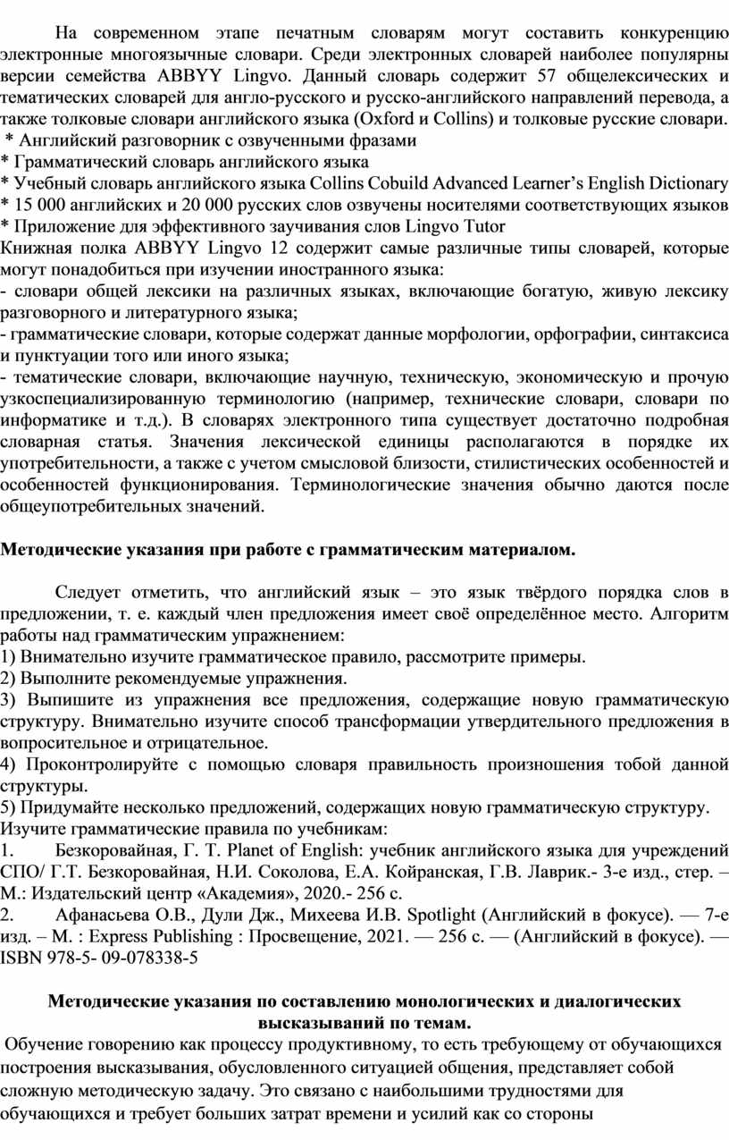 Лексикографические источники предоставляют собой необходимую словарную, фоновую и специальную информацию. Иными словами, специальные словари можно рассматривать на современном этапе как один из мощных информационных ресурсов, играющих ориентирующую и объясняющую роль в изучении иностранного языка и, следовательно, эффективно способствующих реализации образовательной программы в целом. Для эффективного изучения английского языка, студентам необходимо иметь 2 вида словарей: одноязычный словарь (толковый английский словарь); англо-русский / русско-английский (двуязычный словарь). Помимо словарей общеупотребительной лексики, возрастает и число специализированных словарей: толковых, двуязычных, многоязычных; общих, специальных, политехнических, отраслевых, словарей-справочников.