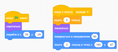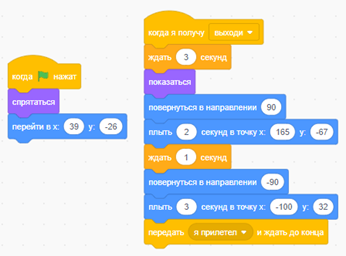 Теперь когда ракета выполнит свой скрипт, с помощью блока "передать сообщение" она пошлет сообщение, которое может перехватить любой объект программы, мы пошлем свое сообщение «Выходи». В данном случае сообщение будет ждать Gobo, потому что только ему мы добавили команду "Выходи". И приходит его очередь действовать: