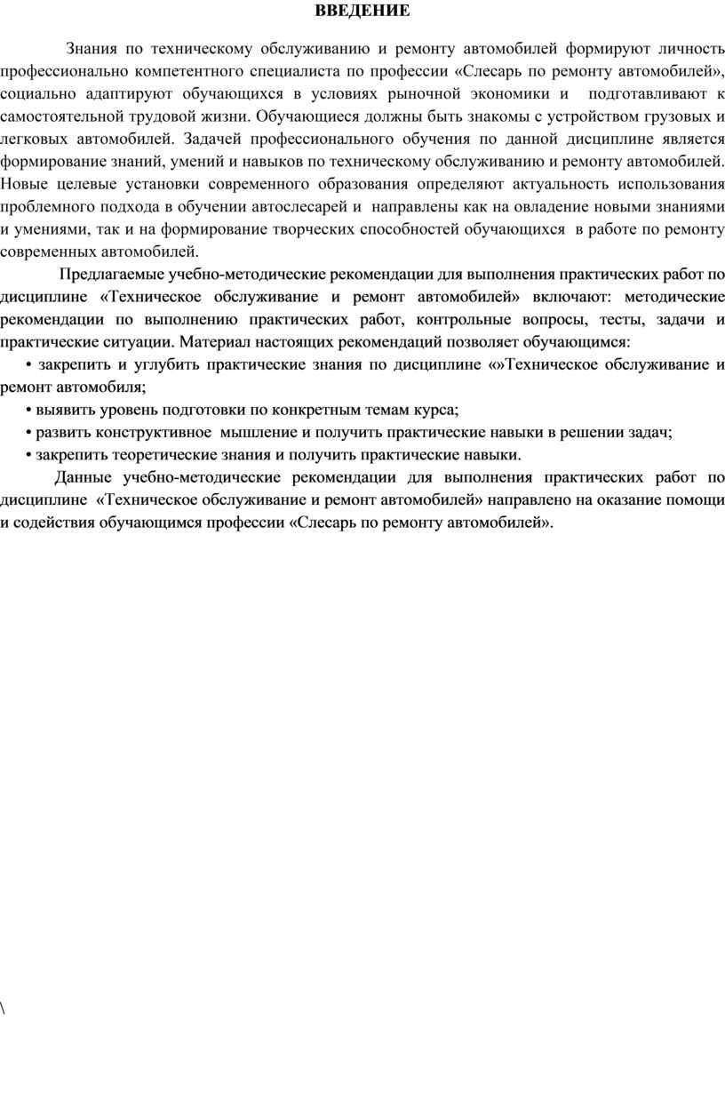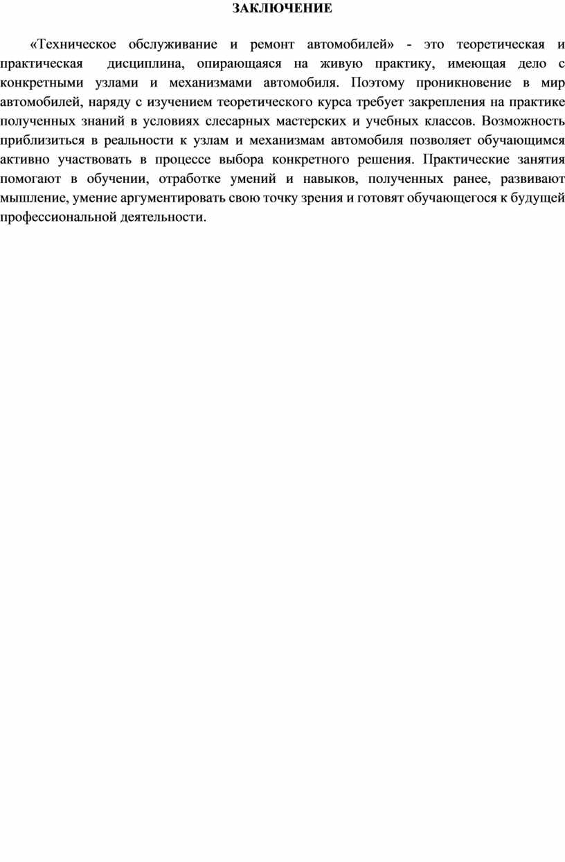 «Техническое обслуживание и ремонт автомобилей» - это теоретическая и практическая дисциплина, опирающаяся на живую практику, имеющая дело с конкретными узлами и механизмами автомобиля. Поэтому проникновение в мир автомобилей, наряду с изучением теоретического курса требует закрепления на практике полученных знаний в условиях слесарных мастерских и учебных классов. Возможность приблизиться в реальности к узлам и механизмам автомобиля позволяет обучающимся активно участвовать в процессе выбора конкретного решения. Практические занятия помогают в обучении, отработке умений и навыков, полученных ранее, развивают мышление, умение аргументировать свою точку зрения и готовят обучающегося к будущей профессиональной деятельности.