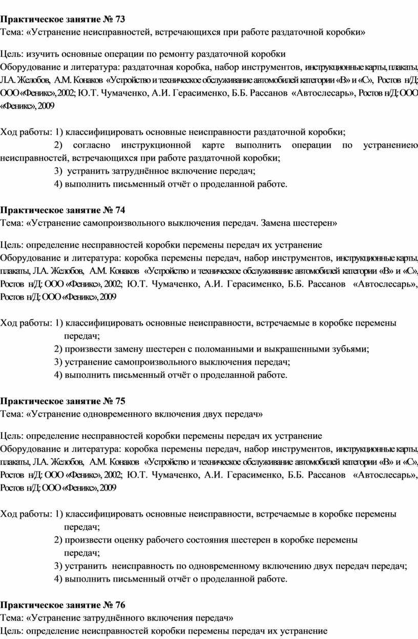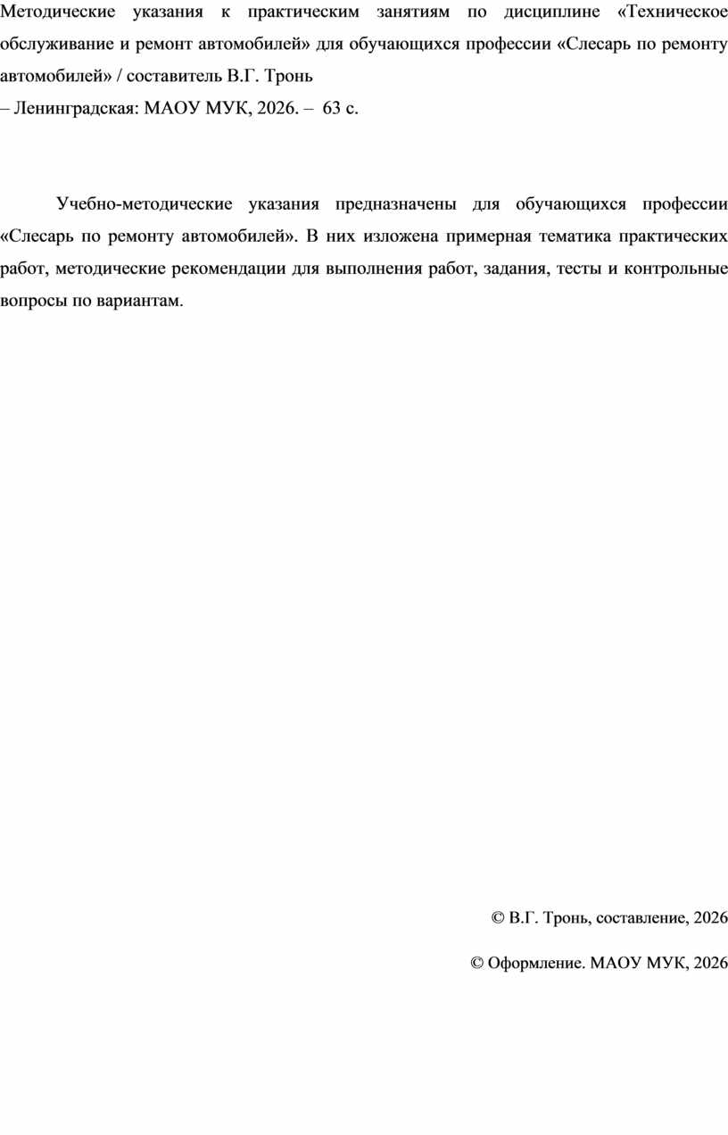 Методические указания к практическим занятиям по дисциплине «Техническое обслуживание и ремонт автомобилей» для обучающихся профессии «Слесарь по ремонту автомобилей» / составитель В.Г. Тронь
