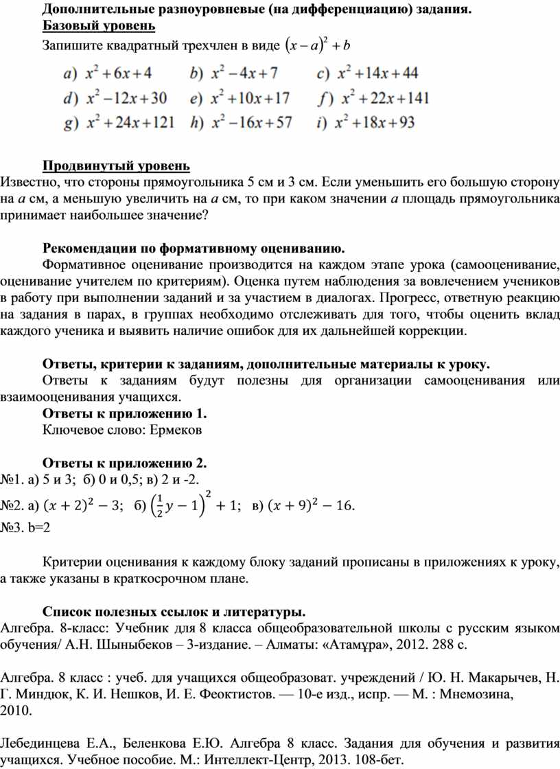 Лебединцева Е.А., Беленкова Е.Ю. Алгебра 8 класс. Задания для обучения и развития учащихся. Учебное пособие. М.: Интеллект-Центр, 2013. 108-бет.