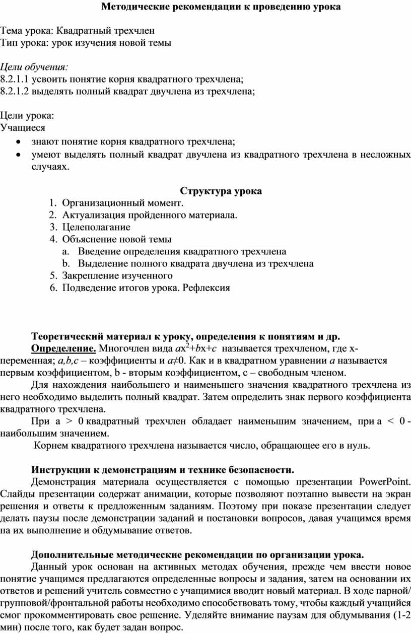 8.2.1.1 усвоить понятие корня квадратного трехчлена;