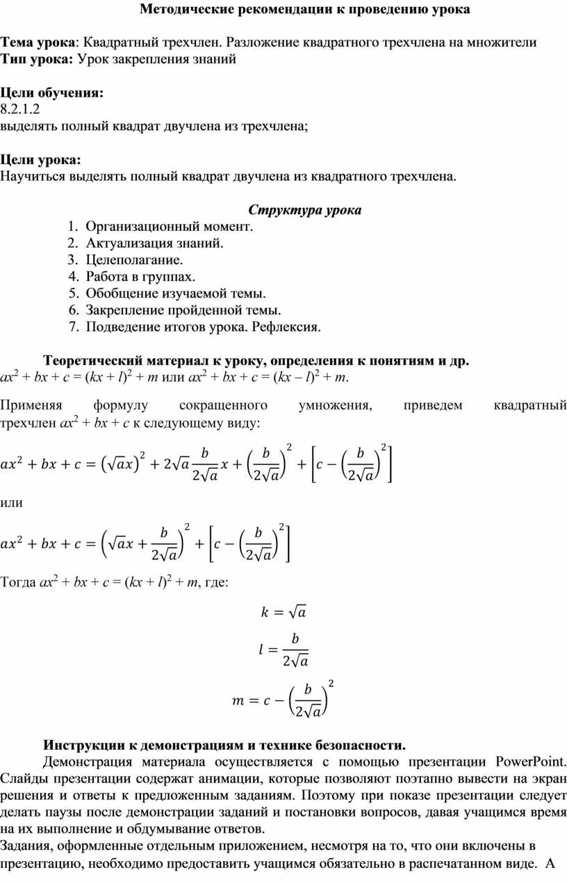 ax2 + bx + c = (kx + l)2 + m или ax2 + bx + c = (kx – l)2 + m.