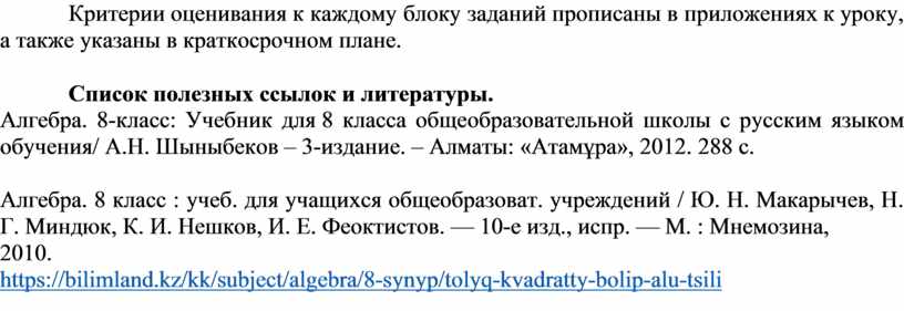 Алгебра. 8-класс: Учебник для 8 класса общеобразовательной школы с русским языком обучения/ А.Н. Шыныбеков – 3-издание. – Алматы: «Атамұра», 2012. 288 с.