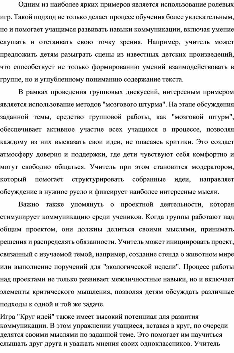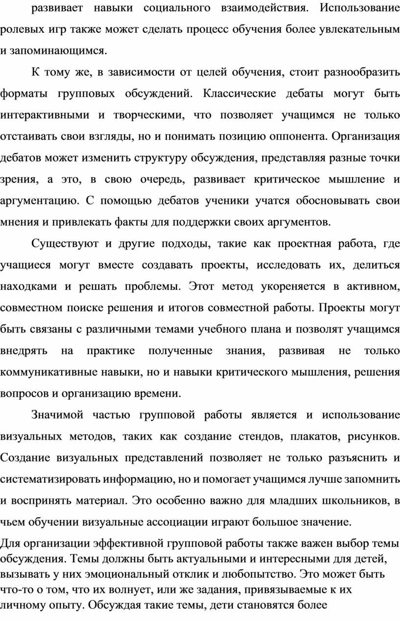 Не менее важным аспектом является роль учителя в организации групповой работы. Учитель направляет процесс, создает безопасную обучающую атмосферу и генерирует подходящие вопросы для обсуждения. Задача педагога – поддерживать активность детей, поощрять их инициативу, а также наблюдать за взаимодействием внутри группы, чтобы вмешаться, если возникает конфликт или разногласие, и помочь детям разрешить их.