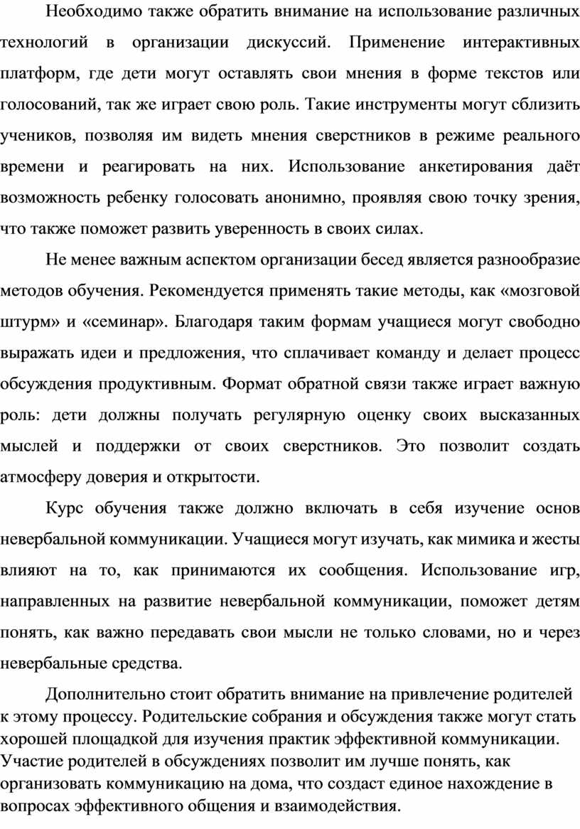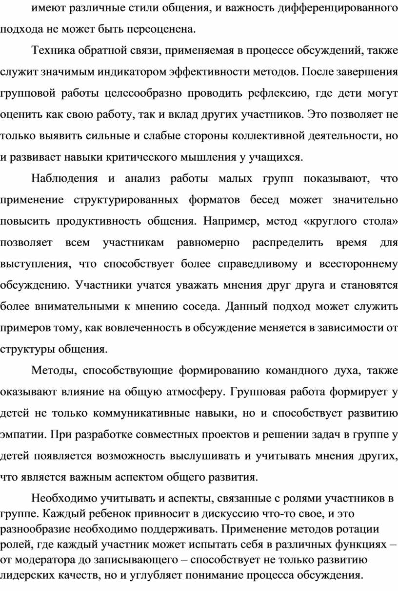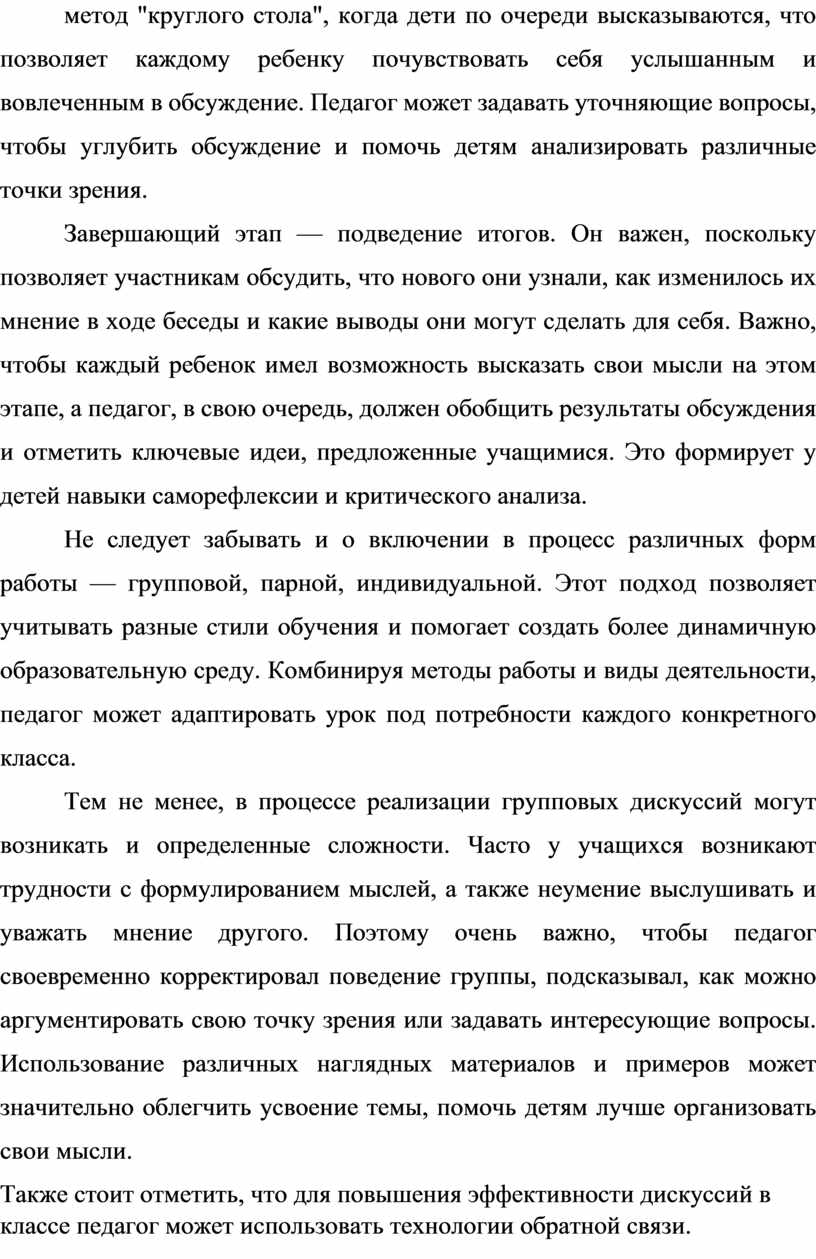 Таким образом, грамотно организованные групповые дискуссии становятся неотъемлемой частью образовательного процесса, способствуя всестороннему развитию детей. Ключом к их успешной реализации является последовательный и продуманный подход, учитывающий интересы и потребности обучающихся, а также создающий условия для активного вовлечения каждого ребенка в общение.