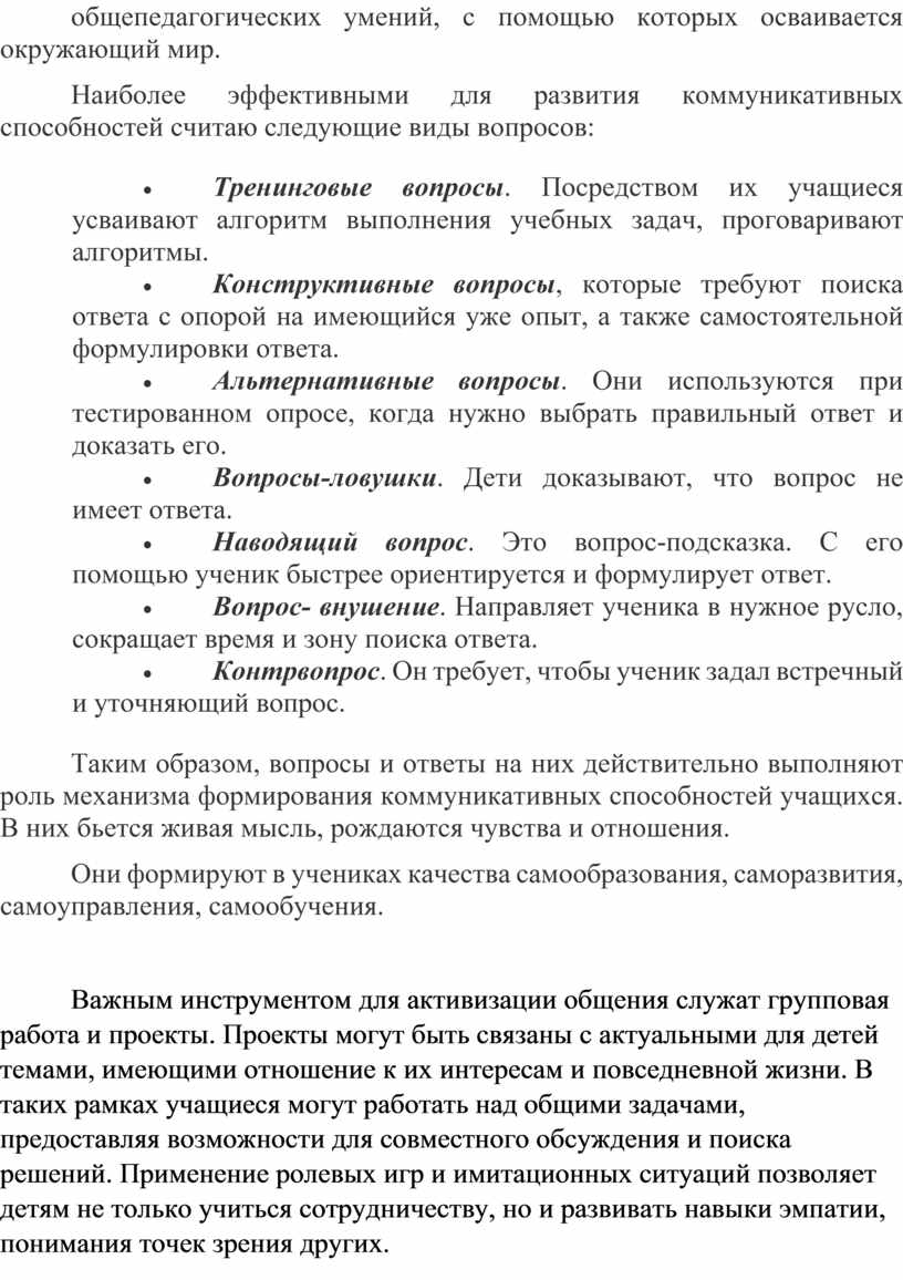 Таким образом, вопросы и ответы на них действительно выполняют роль механизма формирования коммуникативных способностей учащихся. В них бьется живая мысль, рождаются чувства и отношения.