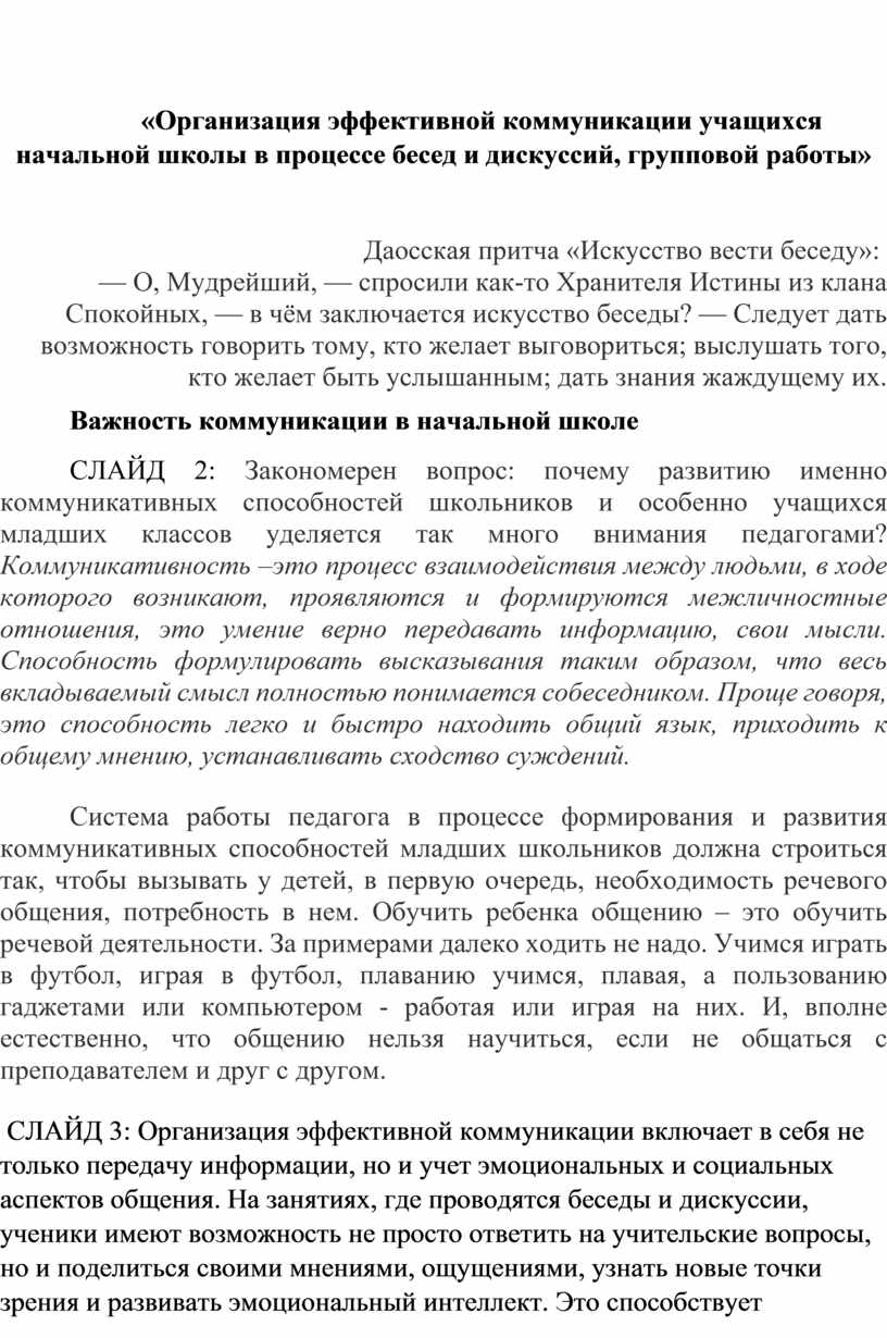 «Организация эффективной коммуникации учащихся начальной школы в процессе бесед и дискуссий, групповой работы»