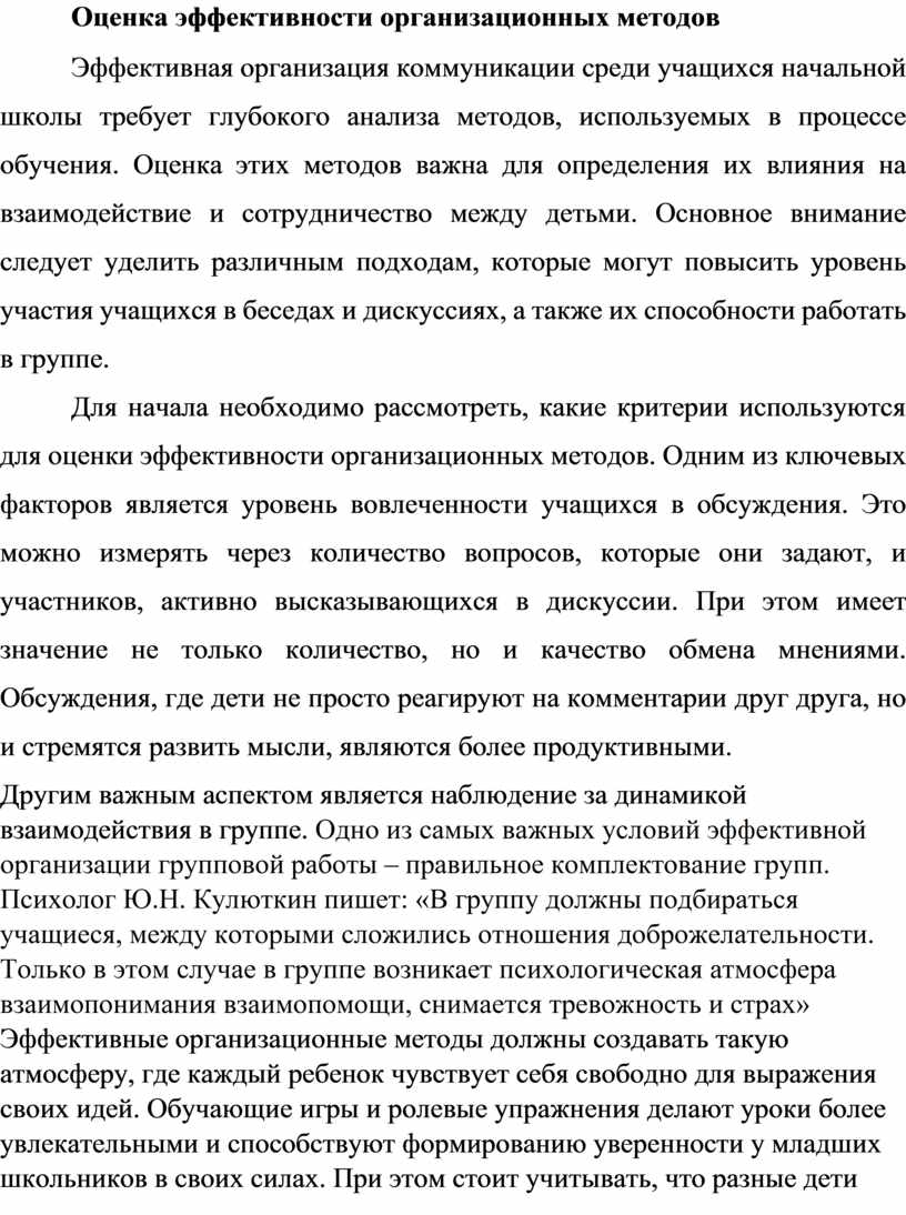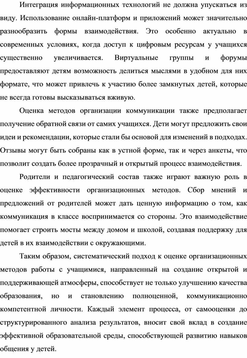 Таким образом, систематический подход к оценке организационных методов работы с учащимися, направленный на создание открытой и поддерживающей атмосферы, способствует не только улучшению качества образования, но и становлению полноценной, коммуникационно компетентной личности. Каждый элемент процесса, от самооценки до структурированного анализа результатов, вносит свой вклад в создание эффективной образовательной среды, способствующей развитию навыков общения у детей.
