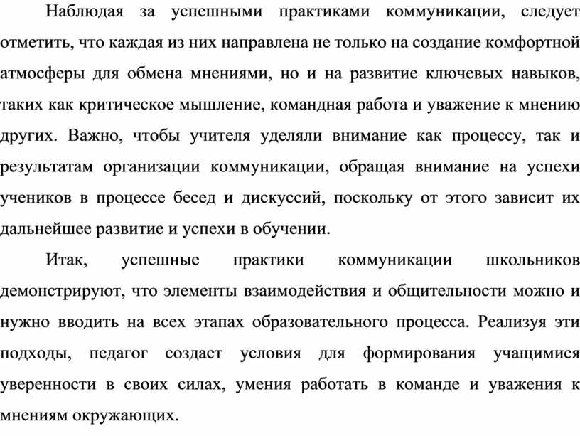 Наблюдая за успешными практиками коммуникации, следует отметить, что каждая из них направлена не только на создание комфортной атмосферы для обмена мнениями, но и на развитие ключевых навыков, таких как критическое мышление, командная работа и уважение к мнению других. Важно, чтобы учителя уделяли внимание как процессу, так и результатам организации коммуникации, обращая внимание на успехи учеников в процессе бесед и дискуссий, поскольку от этого зависит их дальнейшее развитие и успехи в обучении.
