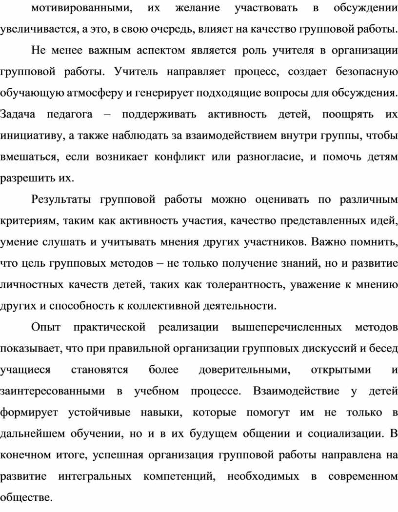 Методы групповой работы, рассмотренные в данной работе, показывают, что разнообразие подходов к организации учебного процесса может значительно повысить уровень вовлеченности учащихся. Работа в парах, малых группах и общие обсуждения в классе позволяют каждому ребенку проявить себя, а также учат их работать в команде. Поэтапная реализация групповых дискуссий, начиная с простых форматов и постепенно переходя к более сложным, обеспечивает комфортный переход для детей от индивидуальной работы к коллективной. Это позволяет им постепенно накапливать опыт и уверенность в своих силах.