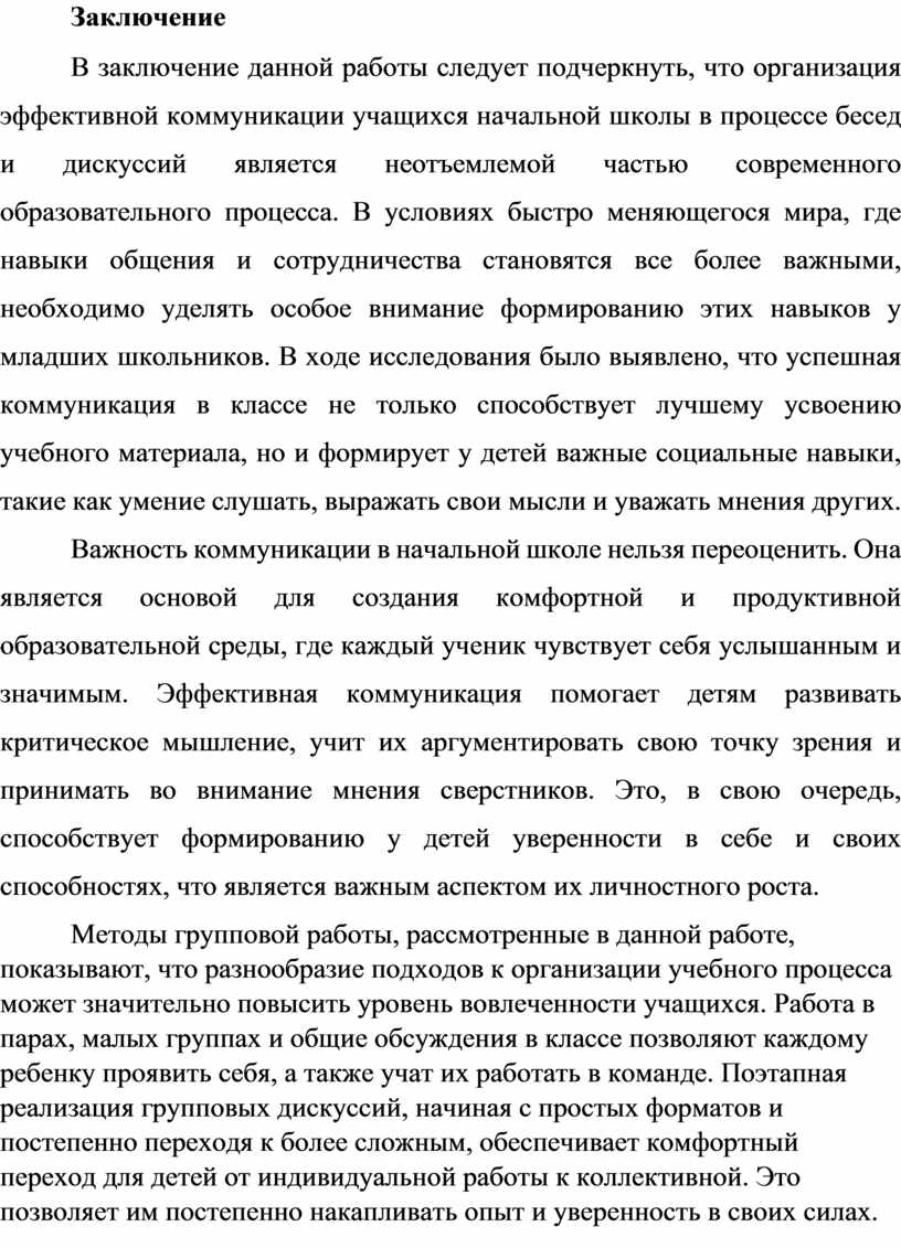 В заключение данной работы следует подчеркнуть, что организация эффективной коммуникации учащихся начальной школы в процессе бесед и дискуссий является неотъемлемой частью современного образовательного процесса. В условиях быстро меняющегося мира, где навыки общения и сотрудничества становятся все более важными, необходимо уделять особое внимание формированию этих навыков у младших школьников. В ходе исследования было выявлено, что успешная коммуникация в классе не только способствует лучшему усвоению учебного материала, но и формирует у детей важные социальные навыки, такие как умение слушать, выражать свои мысли и уважать мнения других.