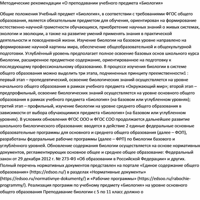 Общие положения Учебный предмет «Биология», в соответствии с требованиями ФГОС общего образования, является обязательным предметом для обучения, ориентирован на формирование естественно-научной грамотности обучающихся, приобретение научных знаний о живых системах, экологии и эволюции, а также на развитие умений применять знания в практической деятельности и повседневной жизни. Изучение биологии на базовом уровне направлено на формирование научной картины мира, обеспечение общеобразовательной и общекультурной подготовки. Углублѐнный уровень предполагает полное освоение базовых основ школьного курса биологии, расширенное предметное содержание, ориентированное на подготовку к последующему профессиональному образованию. В процессе изучения биологии в системе общего образования можно выделить три этапа, подчиненных принципу преемственности1 : первый этап – пропедевтический, освоение биологических знаний осуществляется на уровне начального общего образования в рамках учебного предмета «Окружающий мир»; второй этап – предпрофильный, освоение биологических знаний осуществляется на уровне основного общего образования в рамках учебного предмета «Биология» (на базовом или углубленном уровнях); третий этап – профильный, изучение биологии на уровне среднего общего образования в зависимости от выбора обучающимися предмета «Биология» (на базовом или углубленном уровнях). В условиях обновления ФГОС ООО и ФГОС СОО продолжается дальнейшее развитие школьного биологического образования: вводятся в действие 2 единые федеральные основные образовательные программы для основного и среднего общего образования (далее – ФОП), разработаны федеральные рабочие программы (далее – ФРП) по биологии базового и углублѐнного уровней. Обновление содержания биологии осуществляется на основе нормативных документов, регламентирующих основное общее и среднее общее образование: Федеральный закон от 29 декабря 2012 г. № 273-ФЗ «Об образовании в Российской Федерации» и других. Полный перечень нормативных документов представлен на портале «Единое содержание общего образования» (https://edsoo.ru/) в разделах «Нормативные документы» (https://edsoo.ru/normativnye-dokumenty/) и «Рабочие программы» (https://edsoo.ru/rabochie-programmy/). Реализация программ по учебному предмету «Биология» на уровне основного общего образования Преподавание биологии с 5 по 11 класс должно о