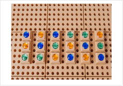 Игры для закрепления понятий: верх – низ, право – лево, выше – ниже, над, под, диагональ, вертикаль, горизонталь. Величина, форма, пространство, время, количество и счет; развитие логики и алгоритмического мышления. Возможность выкладывать с помощью фигур (любых, на выбор ребенка) разнообразные множества, сравнивать и друг с другом, производить операции сложения и вычитания. Наглядность данных действий позволяет использовать педагогу этот прием на занятиях по математике или в свободной игре. С помощью фигурок можно выстраивать простые и сложные закономерности (игры «Продолжи ряд», «Кто следующий», «Башня»). Придумывать логические задания, например, если у нас есть три кристалла разных цветов, сколько вариантов башен мы можем из них построить (если ставить кристаллы друг на друга вертикально). |