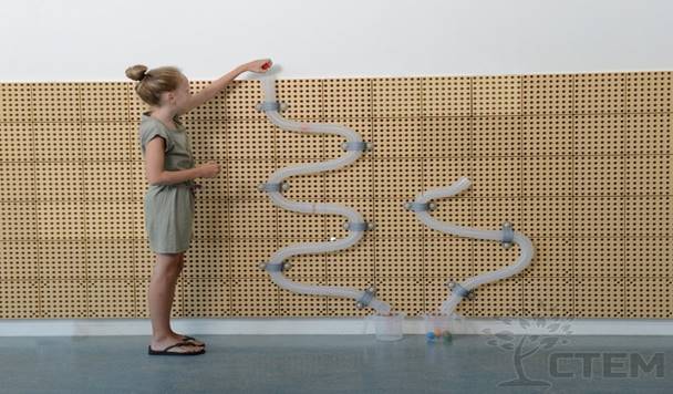 из себя длинную очередь блоков незамкнутой системы. Два больших клапана служат для остановки потока воды в середине системы и кран, который может быть включен или выключен. Дети смогут увидеть, как вода останавливается, а затем продолжает течь, когда они тоже этого хотят.
