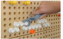 Первый ребенок в ходе выполнения задания должен назвать цвета, инструмент, который он использует, произвести счет до восьми. Второй ребенок должен выкрутить винты, также называя цвета и считая выкрученные винты. В случае ошибки (если первый ребенок ошибся), например, использовал два одинаковых цвета, или вместо 8 болтов вкрутил 7, указать на ошибку. Педагог после выполнения задает вопросы: «Какие цвета ты использовал»?, «Как думаешь, где можно еще применять такие инструменты» и пр.