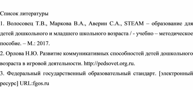 1. Волосовец Т.В., Маркова В.А., Аверин С.А., STEAM – образование для детей дошкольного и младшего школьного возраста / - учебно – методическое пособие. – М.: 2017.