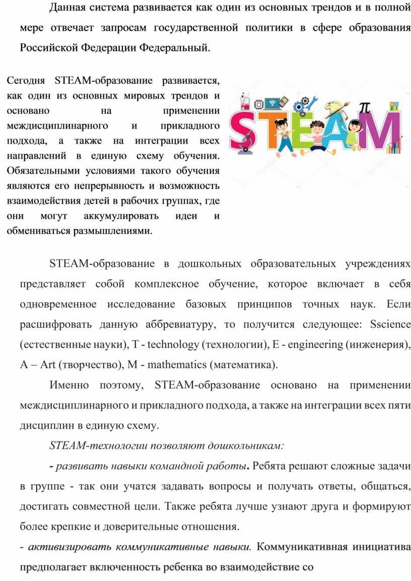 В настоящее время очень актуальна система STEAM образования. Данная система развивается как один из основных трендов и в полной мере отвечает запросам государственной политики в сфере образования Российской Федерации Федеральный.