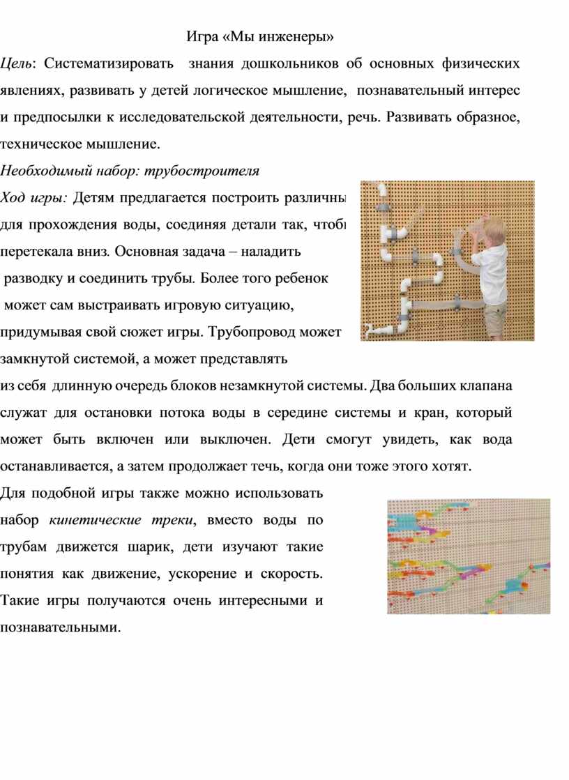 Ход игры: Детям предлагается построить различные интересные маршруты для прохождения воды, соединяя детали так, чтобы вода из верхней точки перетекала вниз. Основная задача – наладить