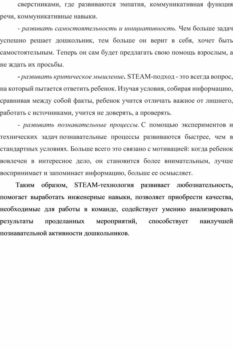 Таким образом, STEАM-технология развивает любознательность, помогает выработать инженерные навыки, позволяет приобрести качества, необходимые для работы в команде, содействует умению анализировать результаты проделанных мероприятий, способствует наилучшей познавательной активности дошкольников.