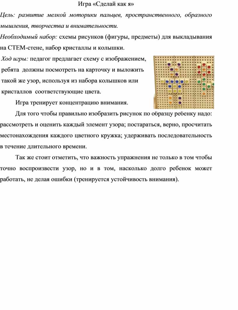 Игры повтори рисунок, запомни цифры и запиши их, графический диктант, выполнение различных задач и упражнений на STEM-стене способствуют развитию внимания и памяти. |
