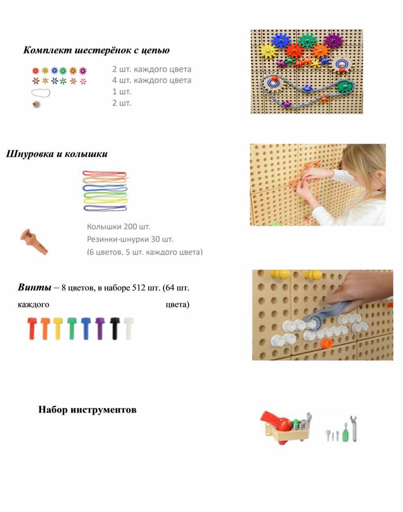 üМногочисленные комплектующие - колышки, винтики, ручные и электрические инструменты, цепи и шестеренки, набор трубостроителя, ручной насос, колышки геометрической формы и т.д. – позволяют проводить разнообразные увлекательно-познавательные игры.