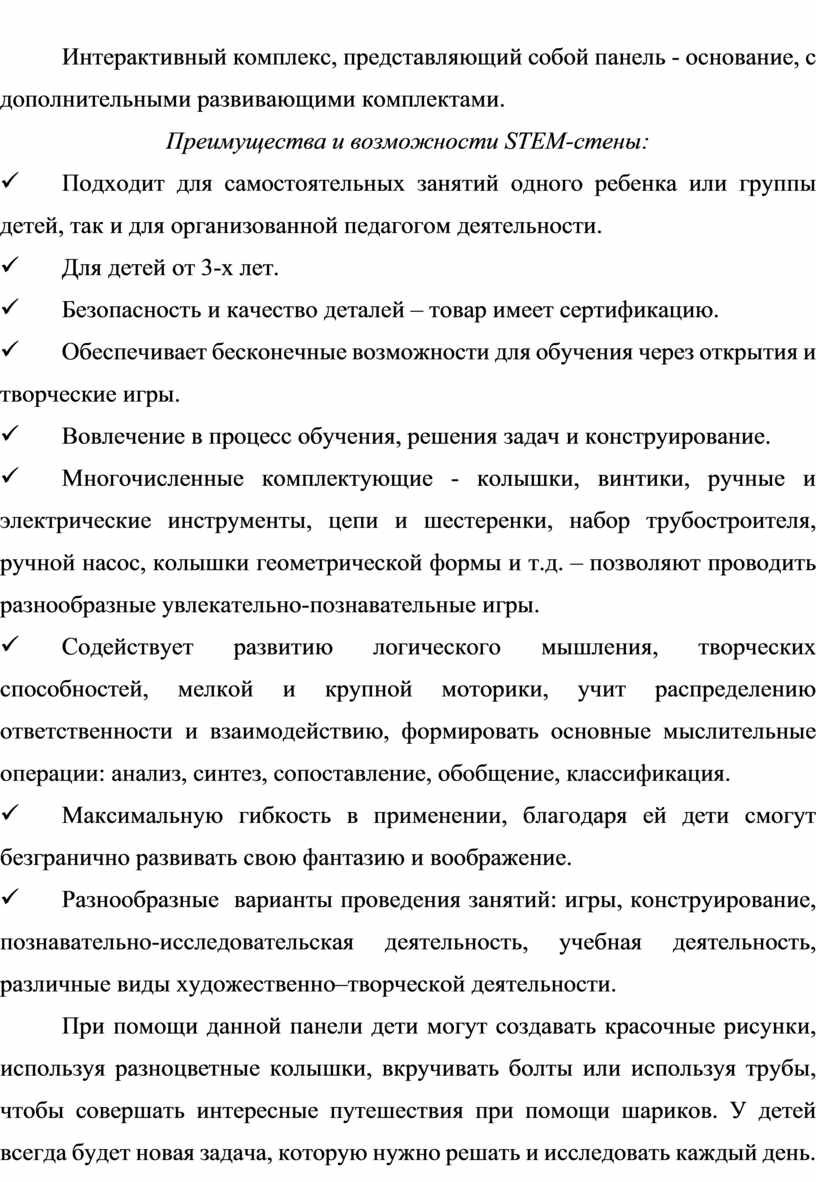 Универсальный модуль СТЕМ-Стена открывает для педагога огромное количество возможностей в направлении детского развития. Его можно использовать как в рамках организованной педагогом деятельности, так и в самостоятельных играх детей в свободное время.