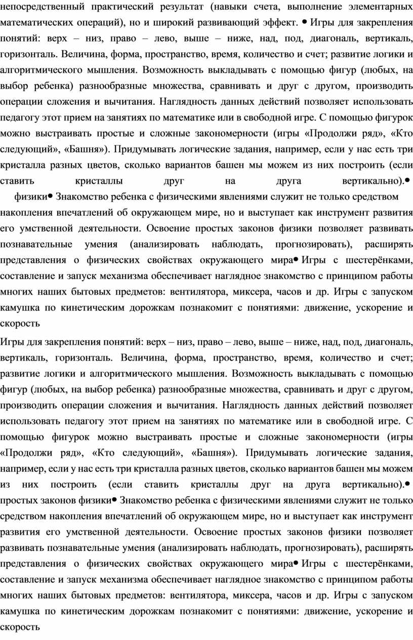 üСодействует развитию логического мышления, творческих способностей, мелкой и крупной моторики, учит распределению ответственности и взаимодействию, формировать основные мыслительные операции: анализ, синтез, сопоставление, обобщение, классификация.