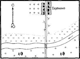 Из точки пересечения шоссе с грунтовой дорогой откладывают к югу 6 см и обозначают металлический мост. Из центра моста определяют направление на юго-запад и обозначают реку. Стрелкой показывают направление ее течения |