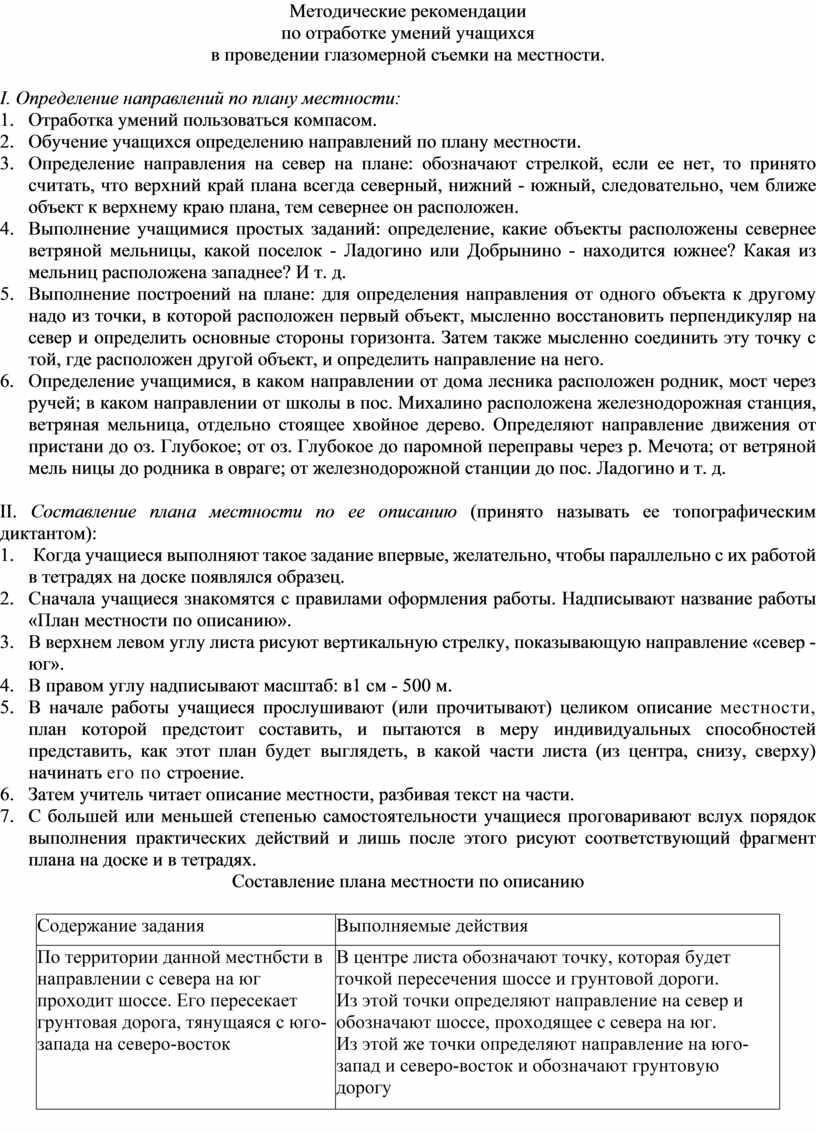 5. В начале работы учащиеся прослушивают (или прочитывают) целиком описание местности, план которой предстоит составить, и пытаются в меру индивидуальных способностей представить, как этот план будет выглядеть, в какой части листа (из центра, снизу, сверху) начинать его по строение.