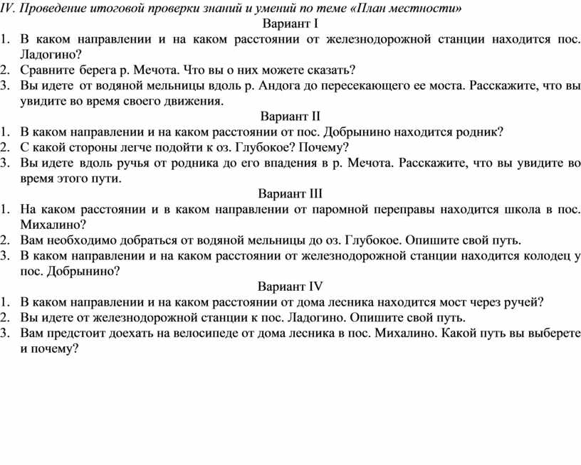 ІV. Проведение итоговой проверки знаний и умений по теме «План местности»