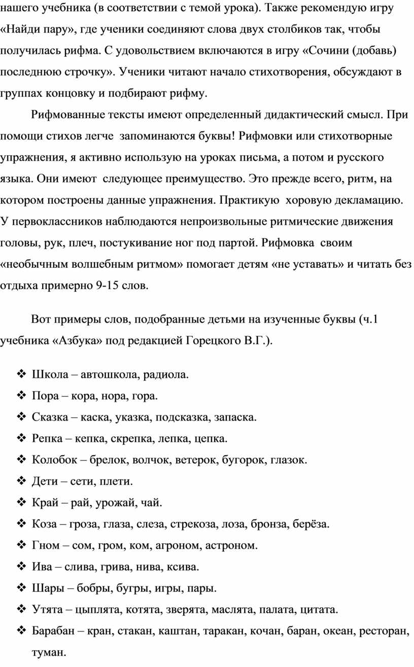 Работая над рифмой, я параллельно решаю главную задачу первоначального чтения и письма - развитие фонематического слуха у первоклассников. На основе прочных фонематических представлений младших школьников и работы на уроке, которая строится на желании детей не только слушать, но и творить, придумывать свои, пусть и не совсем совершенные, но рифмы. Подбирая их, ученики улучшают свой речевой слух, развивают через него чувство родного языка. Рифма привлекает их игрой слов и созвучий.