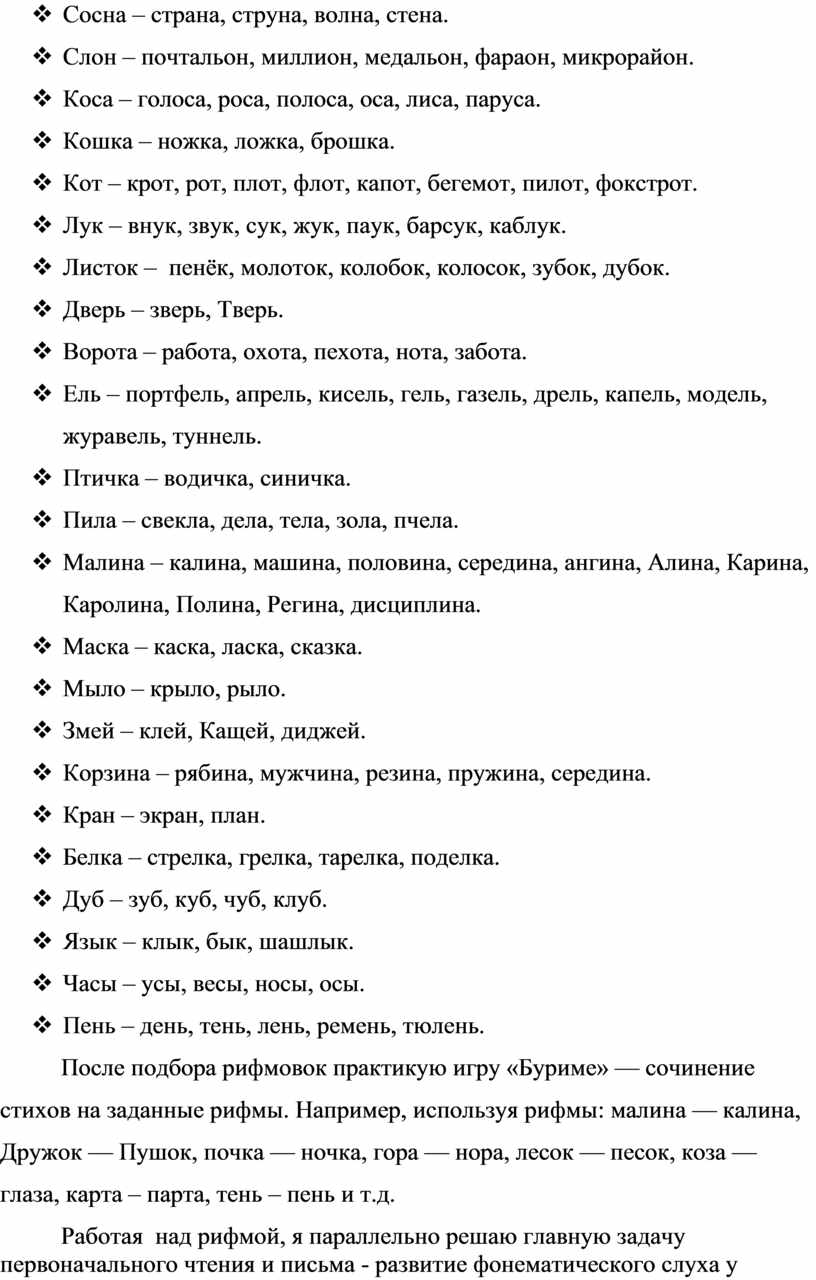 После подбора рифмовок практикую игру «Буриме» — сочинение стихов на заданные рифмы. Например, используя рифмы: малина — калина, Дружок — Пушок, почка — ночка, гора — нора, лесок — песок, коза — глаза, карта – парта, тень – пень и т.д.