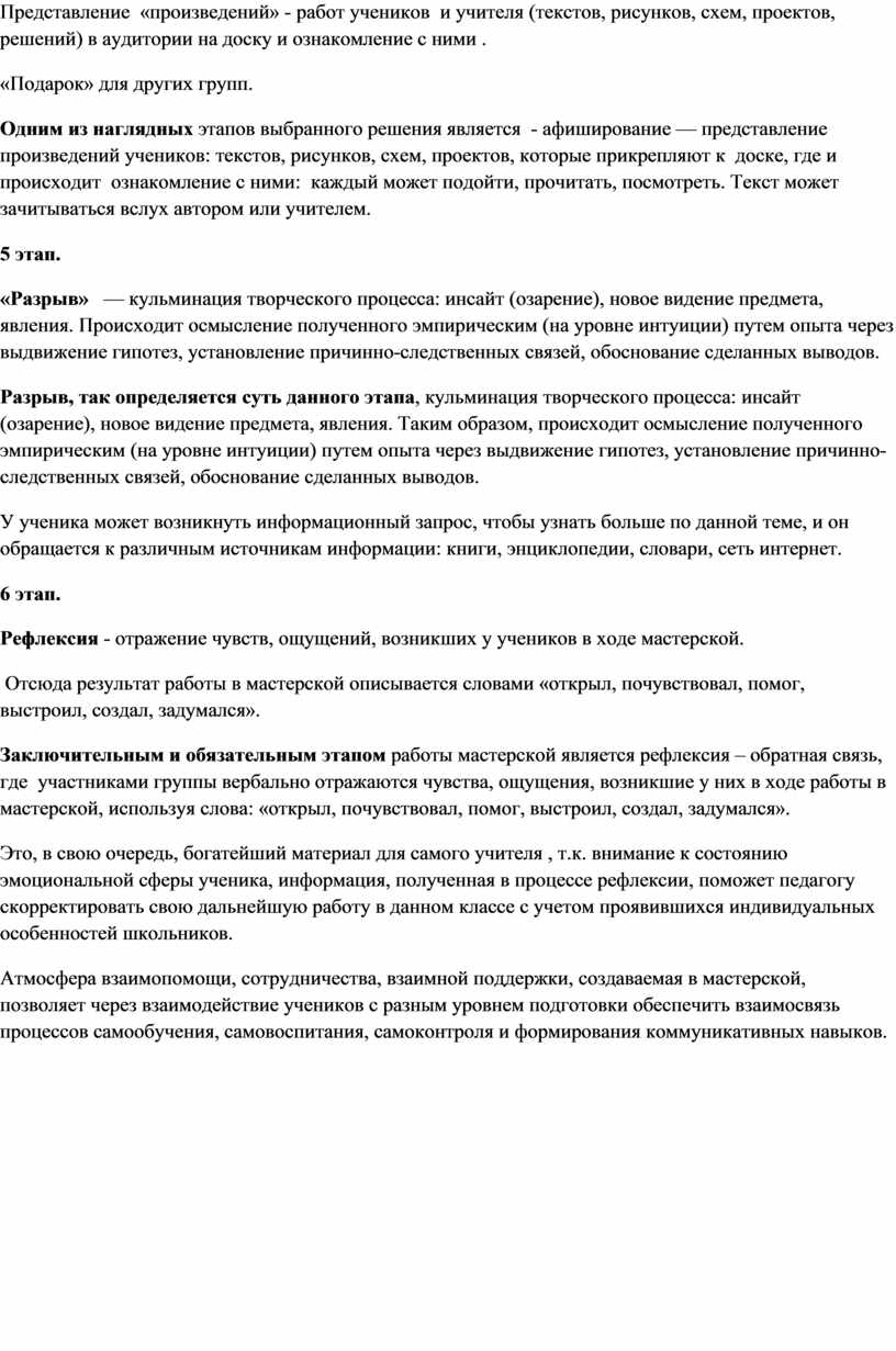 Педагогическая мастерская - это нестандартная форма организации занятий, инновационная технология обучения, которая помогает создать на занятиях творческую атмосферу, психологический комфорт, развивает у учащихся познавательные, творческие и коммуникативные способности, интерес, учебно-познавательную мотивацию, исследовательскую деятельность, позволяет осуществить и эмоционально прочувствовать процесс совместного творчества (сотворчества), поиска знания, путем самостоятельного или коллективного открытия.