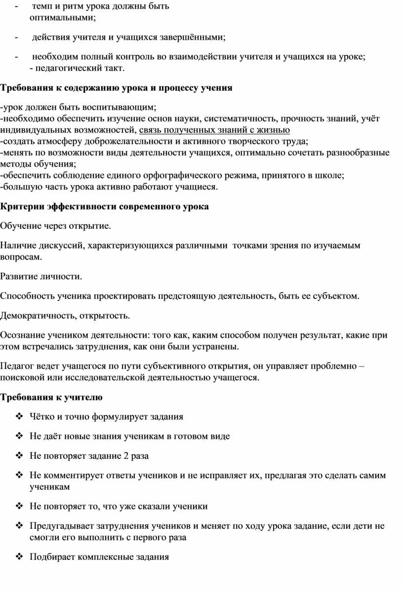 Требования к содержанию урока и процессу учения