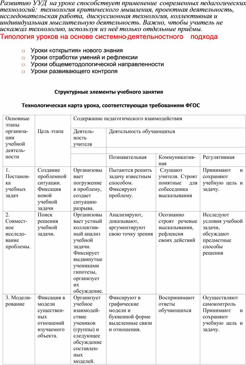 Типология уроков на основе системно-деятельностного подхода