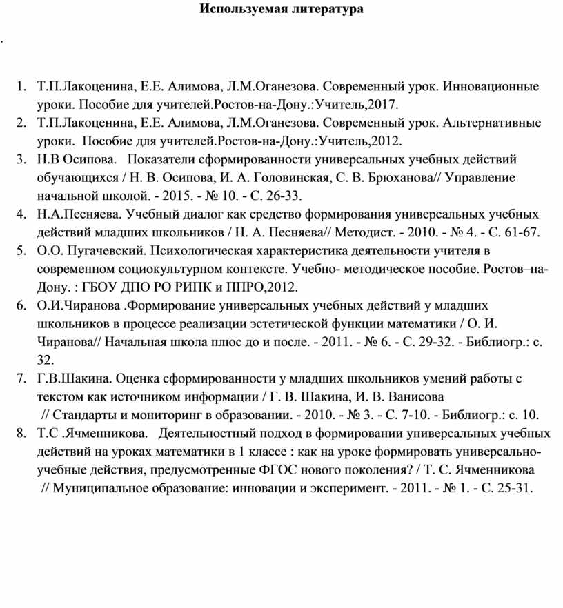 1. Т.П.Лакоценина, Е.Е. Алимова, Л.М.Оганезова. Современный урок. Инновационные уроки. Пособие для учителей.Ростов-на-Дону.:Учитель,2017.