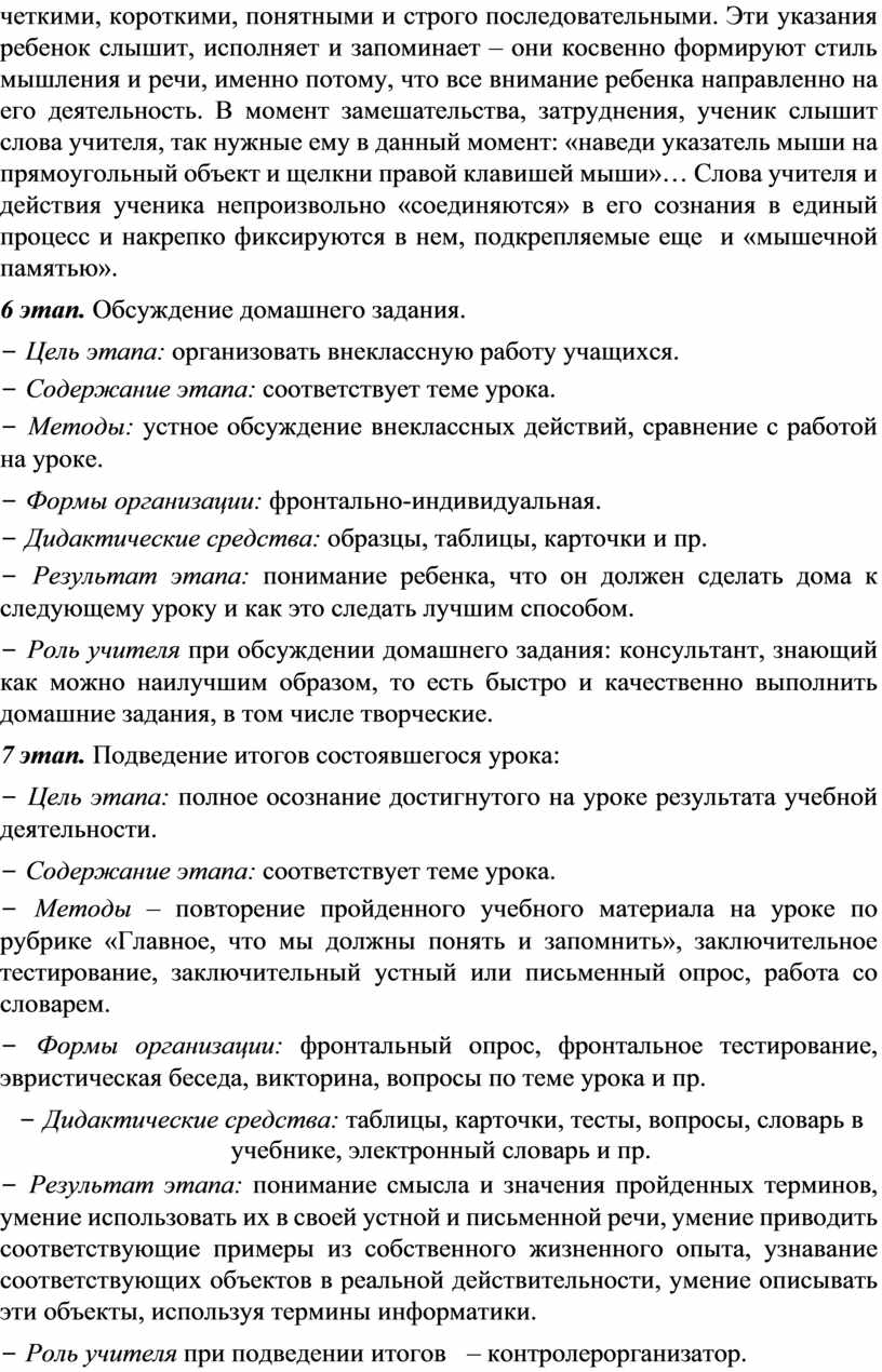 − Результат этапа: понимание смысла и значения пройденных терминов, умение использовать их в своей устной и письменной речи, умение приводить соответствующие примеры из собственного жизненного опыта, узнавание соответствующих объектов в реальной действительности, умение описывать эти объекты, используя термины информатики.
