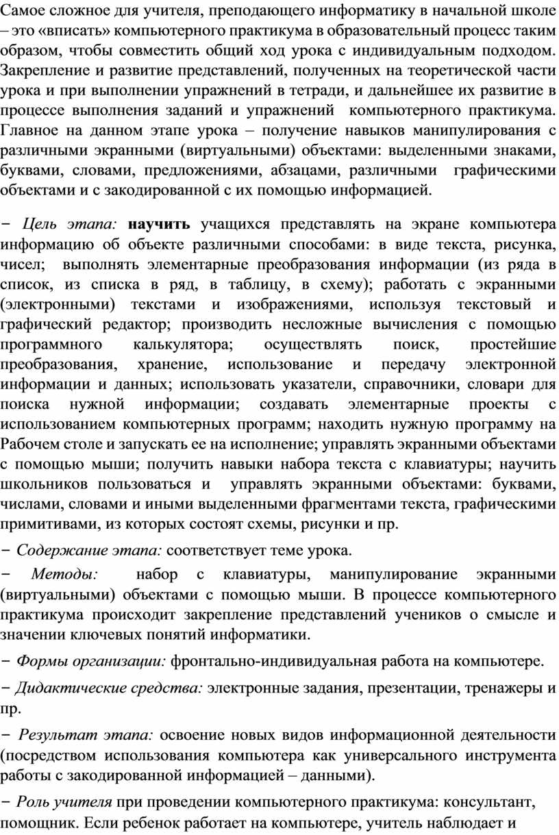 Самое сложное для учителя, преподающего информатику в начальной школе – это «вписать» компьютерного практикума в образовательный процесс таким образом, чтобы совместить общий ход урока с индивидуальным подходом. Закрепление и развитие представлений, полученных на теоретической части урока и при выполнении упражнений в тетради, и дальнейшее их развитие в процессе выполнения заданий и упражнений компьютерного практикума. Главное на данном этапе урока – получение навыков манипулирования с различными экранными (виртуальными) объектами: выделенными знаками, буквами, словами, предложениями, абзацами, различными графическими объектами и с закодированной с их помощью информацией.