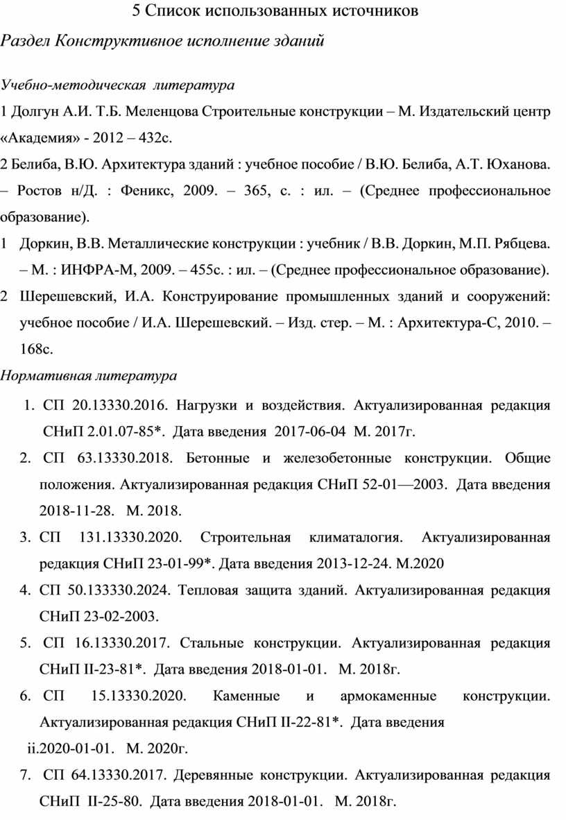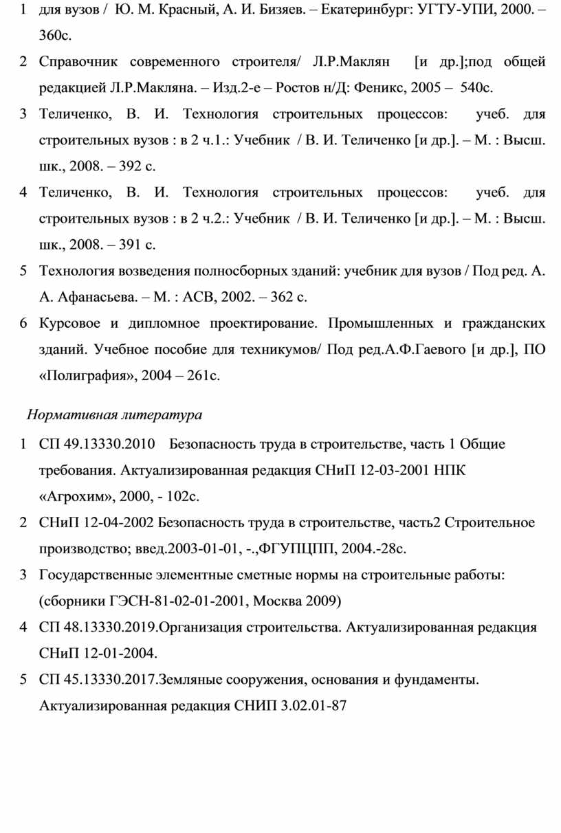 В процессе выполнения дипломного проекта студенты пользуются нормативной литературой, технической, справочной, учебниками и методическими указаниями по разделам.