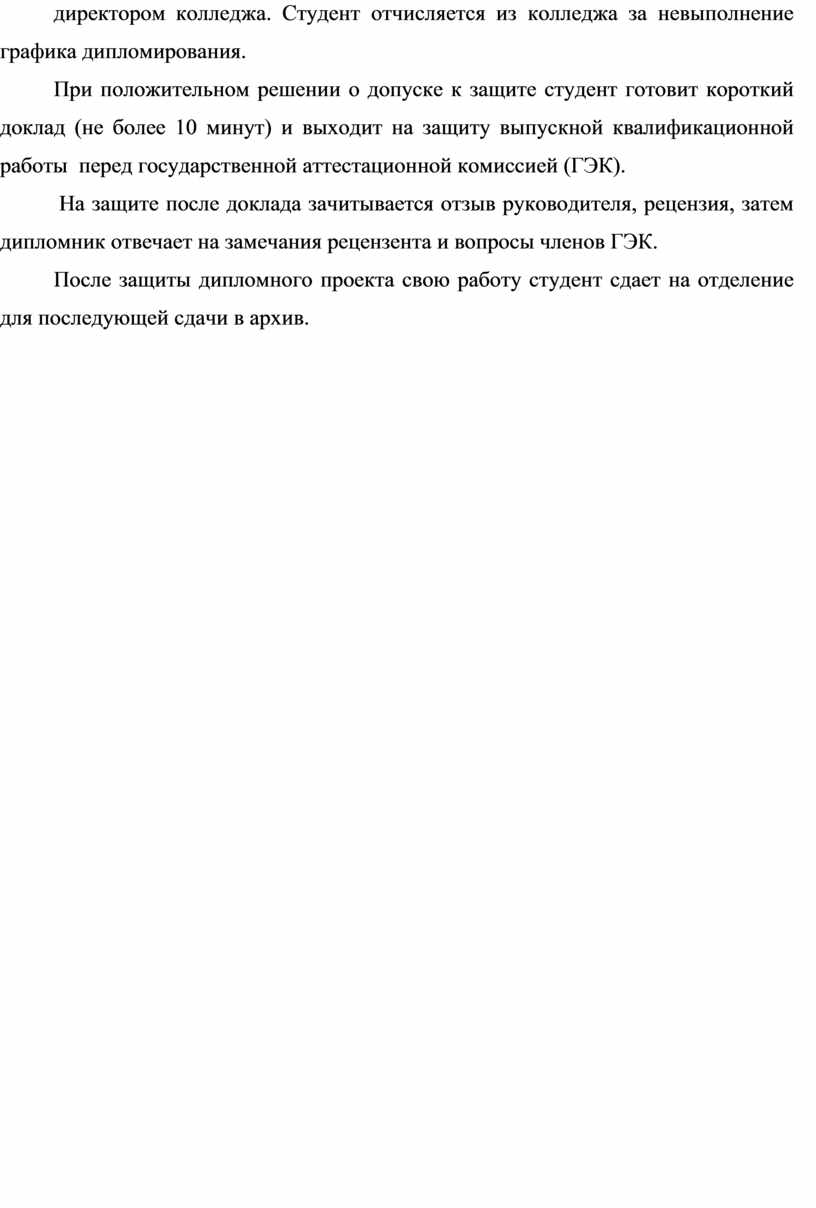 В случае если заведующий отделением не считает возможным допустить студента к защите дипломного проекта, этот вопрос рассматривается на заседании педагогического совета с участием руководителя. Если принимается решение о не допуске студента к защите дипломного проекта, то данное решение заносится в протокол заседания. Протокол заседания педагогического совета утверждается директором колледжа. Студент отчисляется из колледжа за невыполнение графика дипломирования.