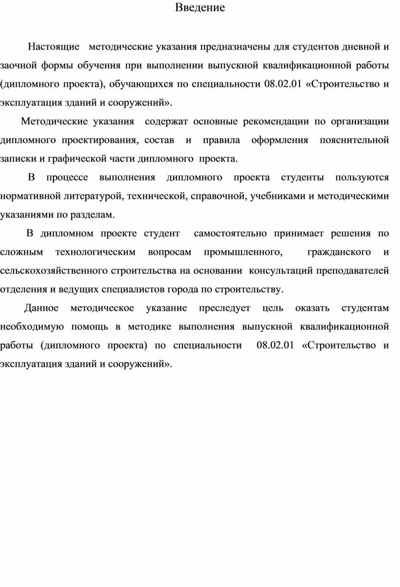 Данное методическое указание преследует цель оказать студентам необходимую помощь в методике выполнения выпускной квалификационной работы (дипломного проекта) по специальности 08.02.01 «Строительство и эксплуатация зданий и сооружений».