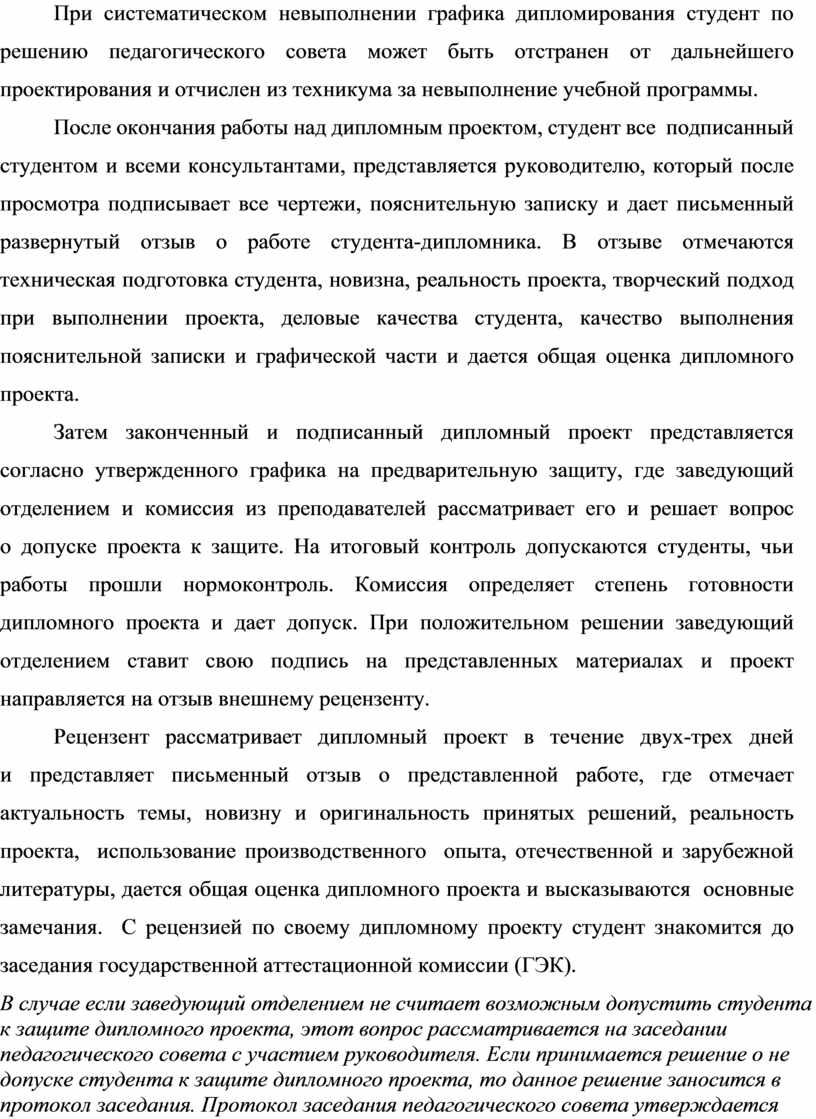 При систематическом невыполнении графика дипломирования студент по решению педагогического совета может быть отстранен от дальнейшего проектирования и отчислен из техникума за невыполнение учебной программы.