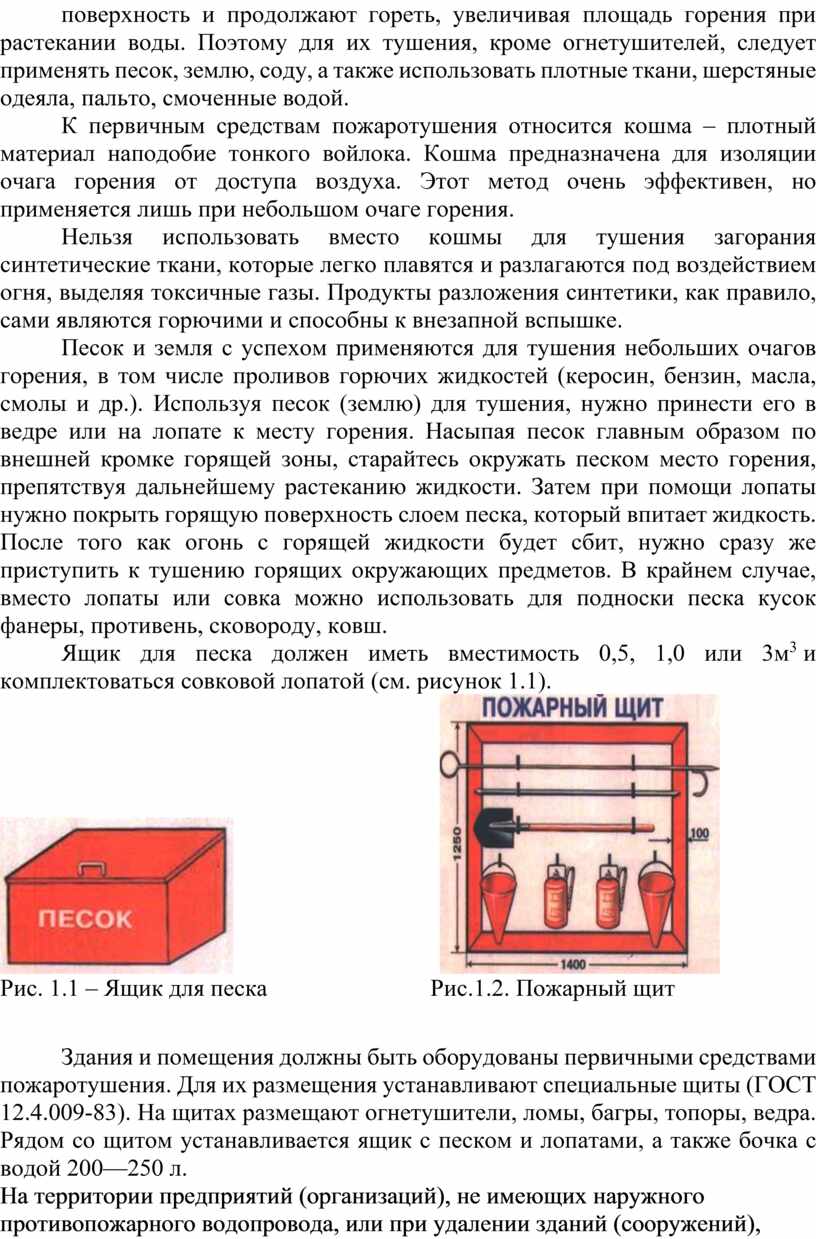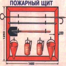 Здания и помещения должны быть оборудованы первичными средствами пожаротушения. Для их размещения устанавливают специальные щиты (ГОСТ 12.4.009-83). На щитах размещают огнетушители, ломы, багры, топоры, ведра. Рядом со щитом устанавливается ящик с песком и лопатами, а также бочка с водой 200—250 л.