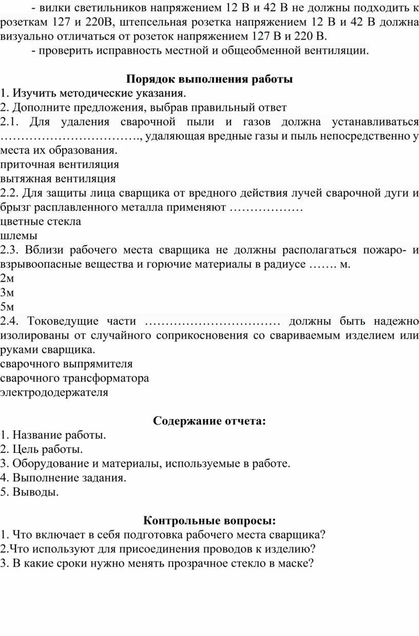- убедиться в исправности сварочного оборудования и соответствии рабочего места требованиям ТБ, исправности заземления сварочной установки, свариваемого изделия;
