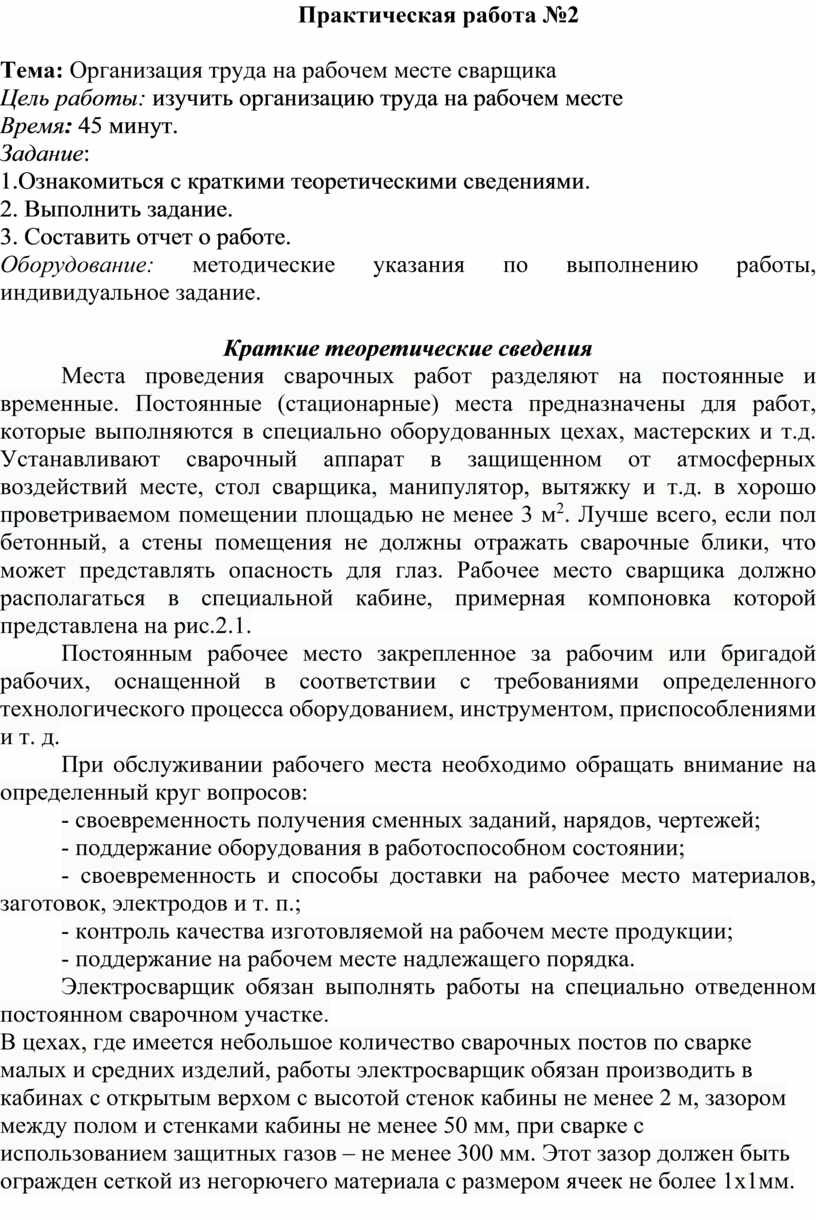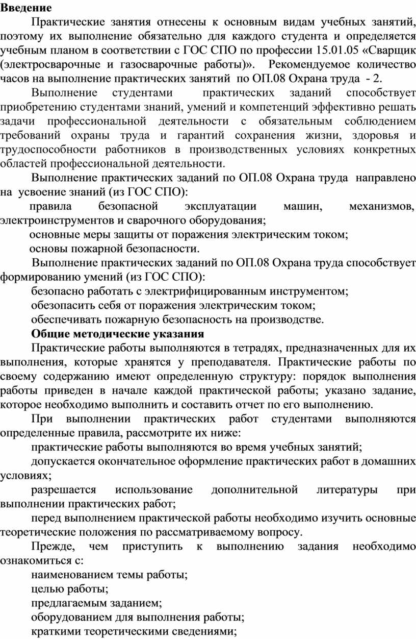 Практические занятия отнесены к основным видам учебных занятий, поэтому их выполнение обязательно для каждого студента и определяется учебным планом в соответствии с ГОС СПО по профессии 15.01.05 «Сварщик (электросварочные и газосварочные работы)». Рекомендуемое количество часов на выполнение практических занятий по ОП.08 Охрана труда - 2.