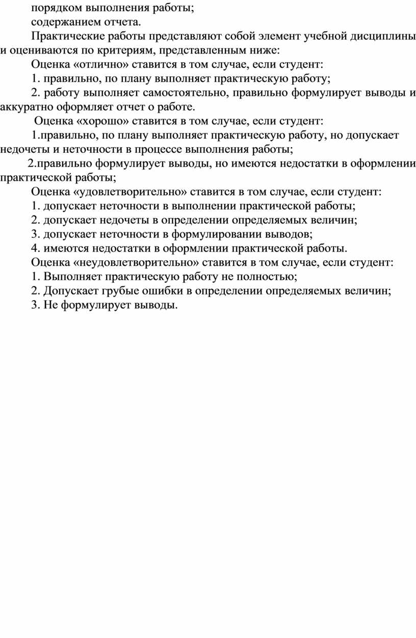 Практические работы выполняются в тетрадях, предназначенных для их выполнения, которые хранятся у преподавателя. Практические работы по своему содержанию имеют определенную структуру: порядок выполнения работы приведен в начале каждой практической работы; указано задание, которое необходимо выполнить и составить отчет по его выполнению.
