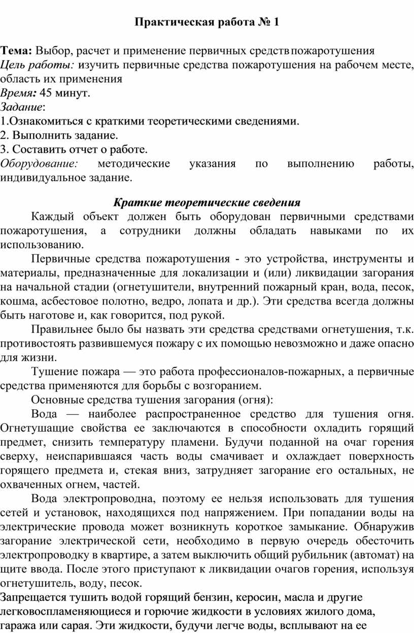 Тема: Выбор, расчет и применение первичных средств пожаротушения