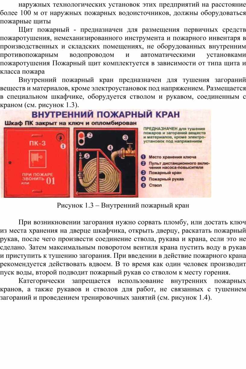 Внутренний пожарный кран предназначен для тушения загораний веществ и материалов, кроме электроустановок под напряжением. Размещается в специальном шкафчике, оборудуется стволом и рукавом, соединенным с краном (см. рисунок 1.3).